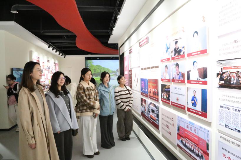 同学们跟随讲解员的指引,沿着历史的脉络,深入了解学校从1904年创办“湖南官立南路师范学堂”至今的发展历程。当看到1922年毛泽东同志来校建立湘南地区第一个党支部的珍贵史料时,现场不时传出阵阵惊叹。25级旅管1班吴季洲同学动容地表示:“站在先辈们曾经奋斗过的地方,看着这些珍贵的历史照片,我仿佛穿越到了那个热血沸腾的年代。作为新时代青年,我们要继承这份红色基因,不负时代使命。”